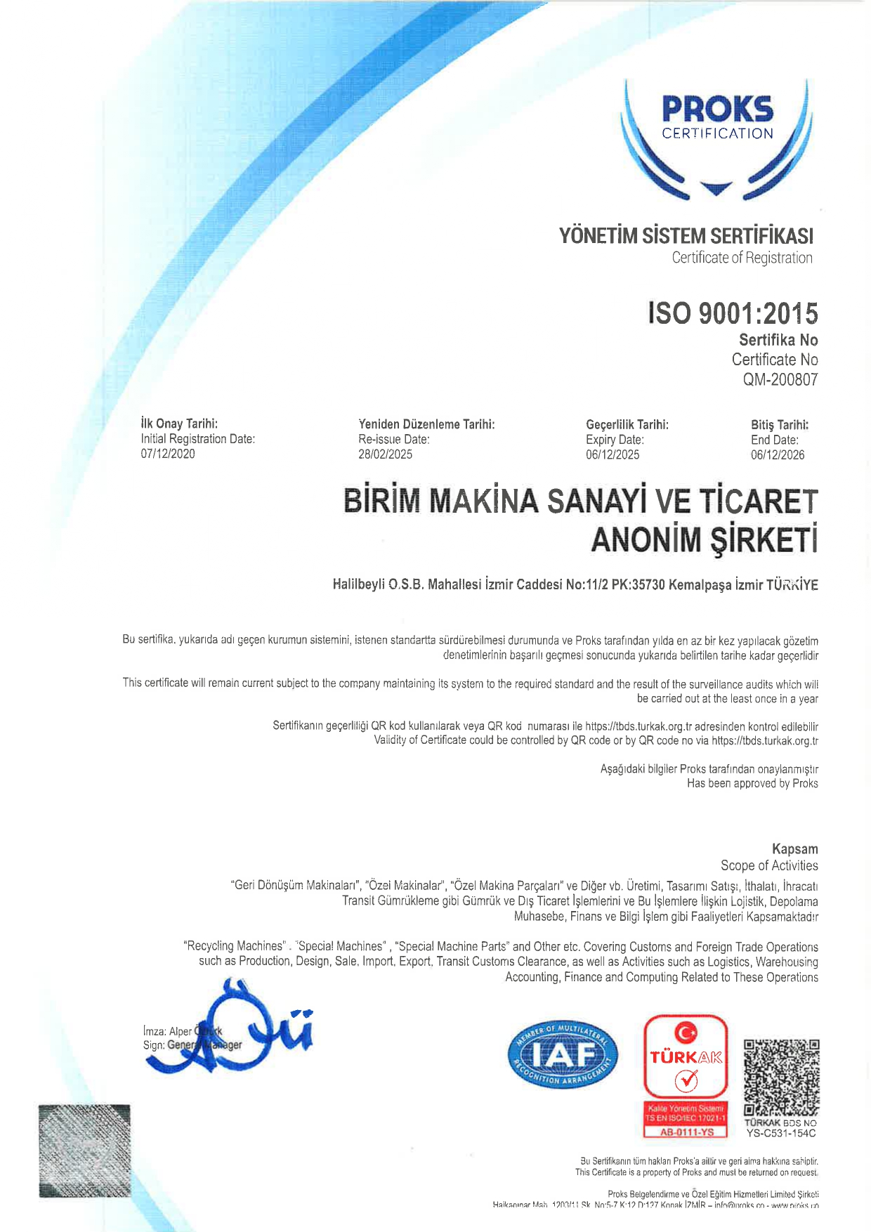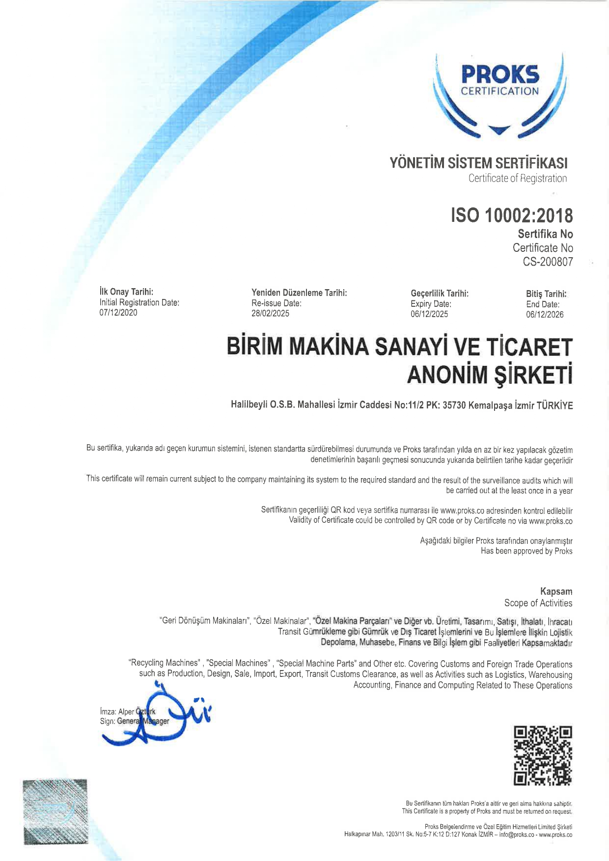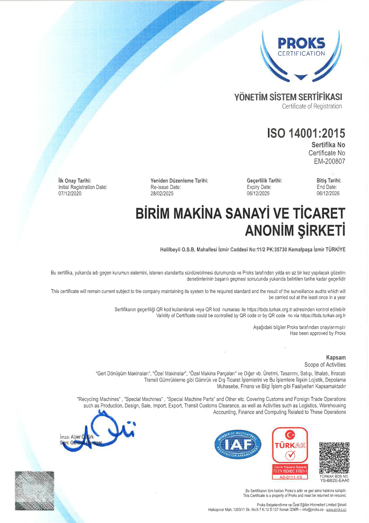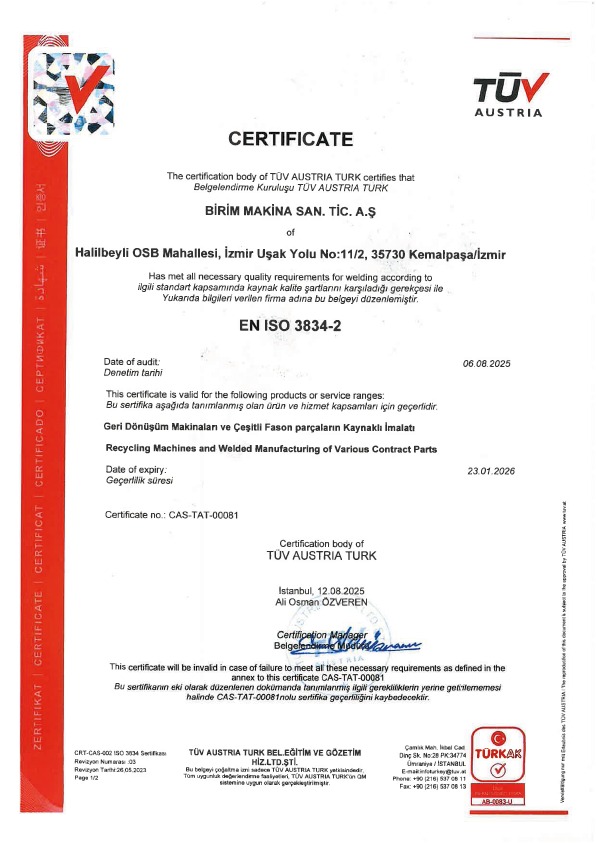 Birim Machining olarak, uluslararası kalite standartlarına uygun üretim süreçlerimizle güvenilir ve sürdürülebilir çözümler sunuyoruz. ISO 9001, ISO 10002, ISO 14001, ISO 3834-2, ISO 14064-1 ve Karbon Doğrulama sertifikalarımız ile üretimde kaliteyi, çevreye duyarlılığı ve müşteri memnuniyetini garanti altına alıyoruz.